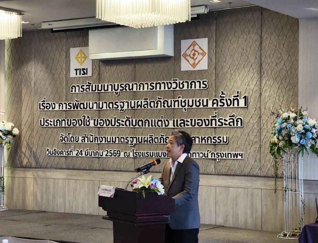 วันที่ 24 มีนาคม 2569 นางอรุณี คันธมาลา อุตสาหกรรมจังหวัดตาก มอบหมายให้ นางสาวกาญจนา งามพรม เข้าร่วมสัมมนาบูรณาการทางวิชาการ เรื่อง “การพัฒนามาตรฐานผลิตภัณฑ์ชุมชน ครั้งที่ 1 ประเภทของใช้ ของประดับตกแต่ง และของที่ระลึก โดยมีวัตถุประสงค์เพื่อให้ผู้ที่เกี่ยวข้องประกอบด้วย ผู้ผลิตชุมชน ผู้บริโภค ผู้ทดสอบ นักวิชาการจากหน่วยงานต่างๆทั้งภาครัฐและเอกชน ได้เข้าร่วมให้ข้อคิดเห็นข้อกำหนดมาตรฐานผลิตภัณฑ์ชุมชนที่เหมาะสมถูกต้องตามหลักวิชาการและสอดคล้องกับกฎหมายที่เกี่ยวข้องซึ่งเป็นการยกระดับคุณภาพผลิตภัณฑ์ชุมชนให้เป็นที่ยอมรับมากขึ้น ในส่วนของ สำนักงานอุตสาหกรรมจังหวัดตาก ได้ขอกำหนดมาตรฐาน เรื่อง "ผลิตภัณฑ์ประดิษฐ์จากอิฐมวลเบา" ณ โรงแรม แบงค็อก มิดทาวน์ กรุงเทพฯ