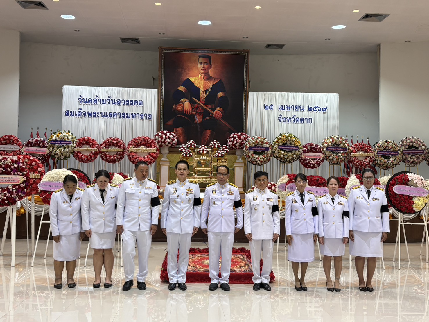 วันที่ 25 เมษายน 2569 เวลา 07.30 น. นางอรุณี คันธมาลา อุตสาหกรรมจังหวัดตาก มอบหมายให้ นางสาวเบญจมาภรณ์ แผ่นคำ หัวหน้ากลุ่มส่งเสริมและพัฒนาอุตสาหกรรม เข้าร่วมพิธีวางพวงมาลาถวายราชสักการะในวันคล้ายวันสวรรคตสมเด็จพระนเรศวรมหาราช ประจำปี พ.ศ. 2569 โดยมี นายชูศักดิ์ รู้ยิ่ง ผู้ว่าราชการจังหวัดตาก เป็นประธานในพิธีวางพวงมาลาถวายราชสักการะ จุดธูปเทียนเครื่องทองน้อย และกล่าวคำถวายราชสดุดีเนื่องในวันคล้ายวันสวรรคตสมเด็จพระนเรศวรมหาราช ประจำปี 2569 พร้อมด้วย รองผู้ว่าราชการจังหวัดตาก หัวหน้าส่วนราชการ/รัฐวิสาหกิจ ข้าราชการ สมาชิกเหล่ากาชาด และแม่บ้านมหาดไทยจังหวัดตาก เข้าร่วมพิธี เพื่อน้อมรำลึกถึงพระมหากรุณาธิคุณอันยิ่งใหญ่ของพระองค์ท่าน ที่ทรงมีต่อแผ่นดินไทย ณ หอประชุมจังหวัดตาก ศาลากลางจังหวัดตาก
